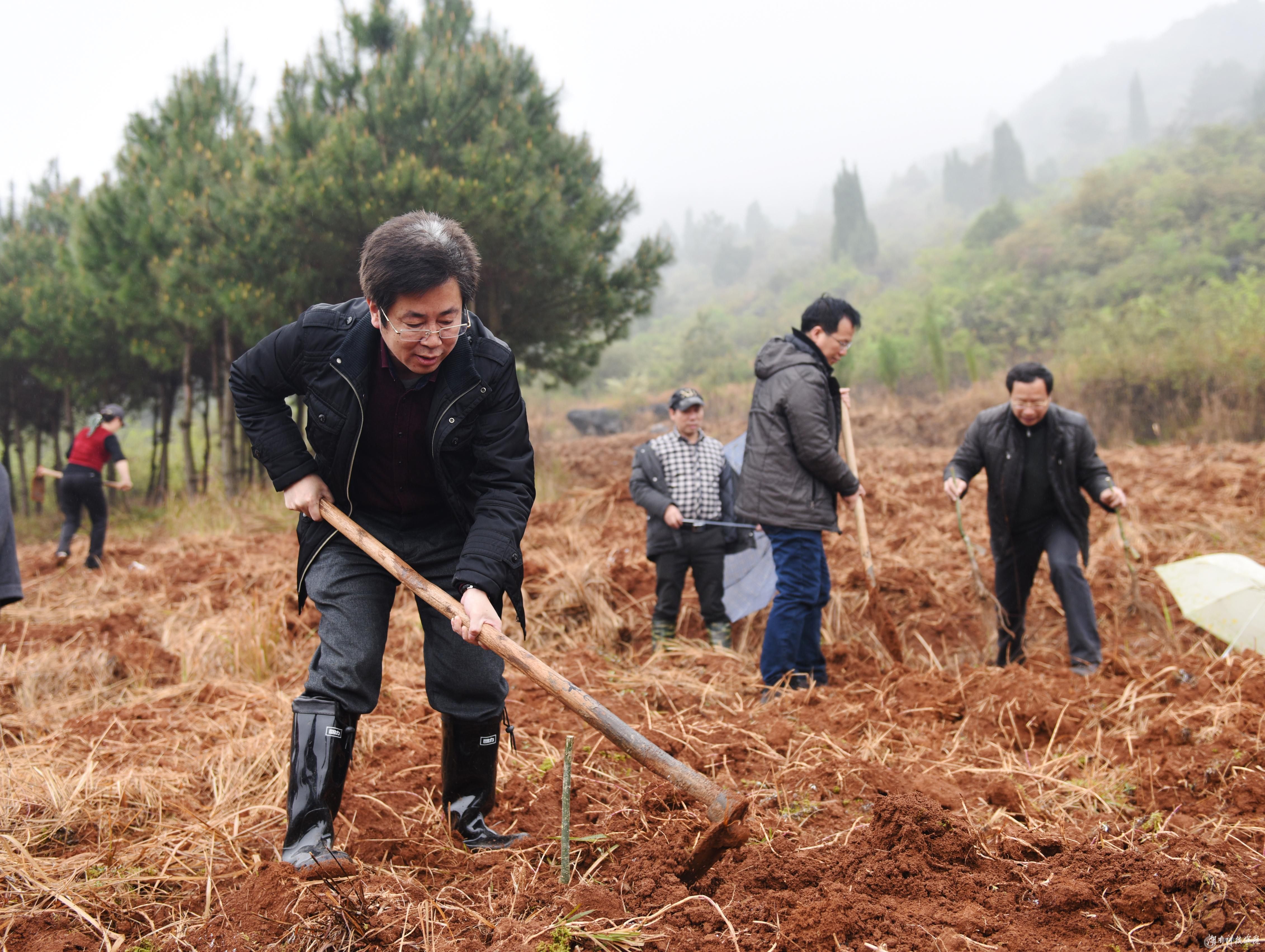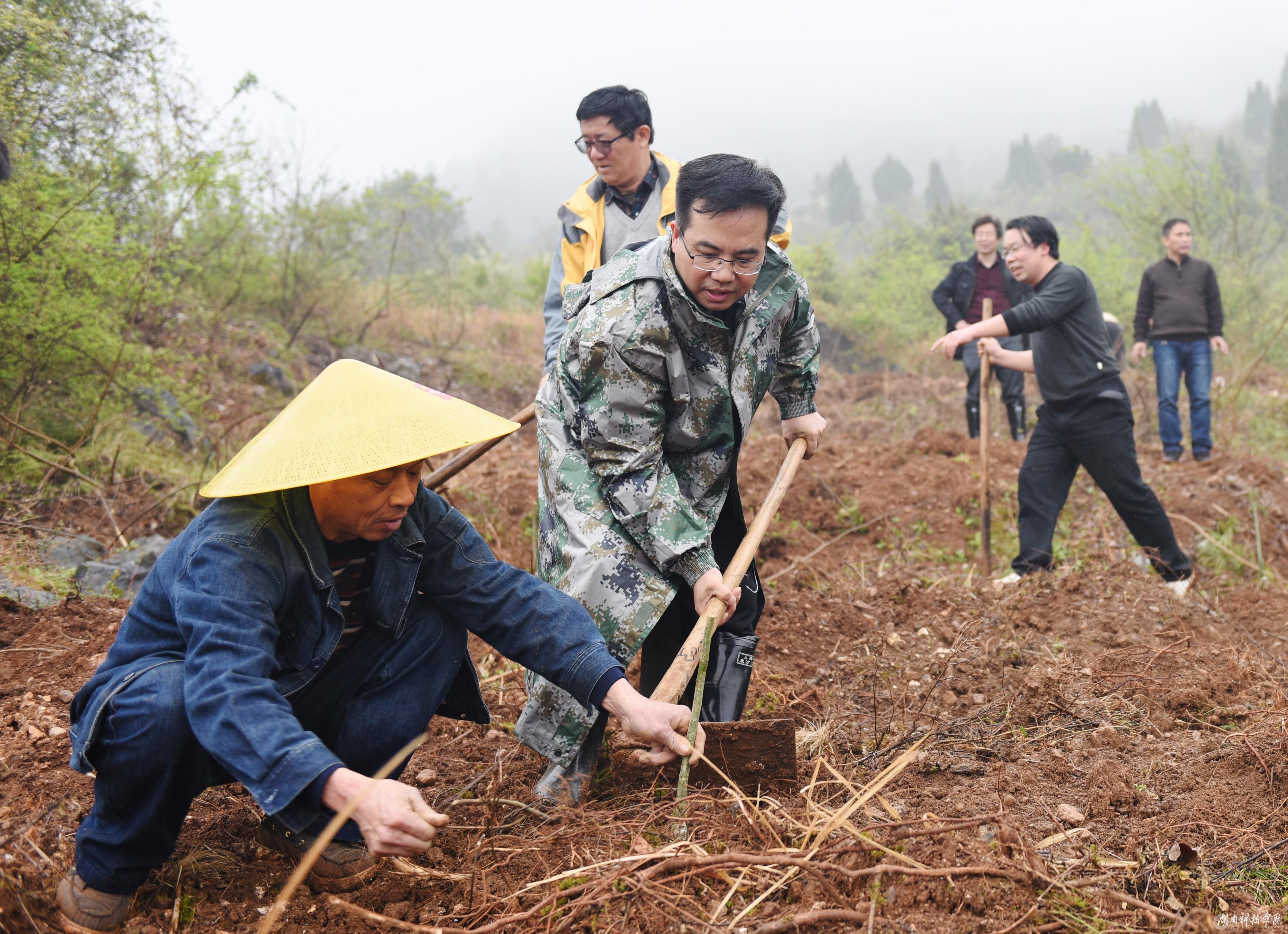 本网讯 (通讯员 周平尚) 助栽致富林,兴业促脱贫。3月16日,新田县龙泉镇潮水铺村细雨蒙蒙,伟德国际1946源于英国校党委书记陈弘、校长曾宝成等校领导和40余名中层干部来到该村开山种树,发展金槐产业,为缺乏劳动力的贫困户种植金槐500余株,为当地金槐产业再添一片新绿。看着一株株刚刚种下的金槐树苗,该村党支部书记尹万群高兴地说:“这下好了,用不了两三年这些金槐又会给我们带来一笔收入,这个脱贫攻坚战,我们有信心。”