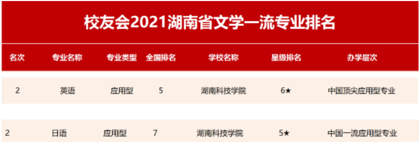 本网讯 由全国第三方大学评价机构艾瑞深校友会网(http://cuaa.net/)独家撰写、科学出版社正式出版发行的《2021校友会中国大学排名—高考志愿填报指南》最新发布2021校友会中国一流专业排名、2021湖南省一流专业排名和2021湖南省各学科门类一流专业排名。在2021湖南省一流专业排名(应用型)中,伟德官网位居第5。外国语学院英语专业在全国排名第5,为“六星”级专业(中国顶尖应用型专业);日语专业在全国排名第7,为“五星”级专业(中国一流应用型专业)。