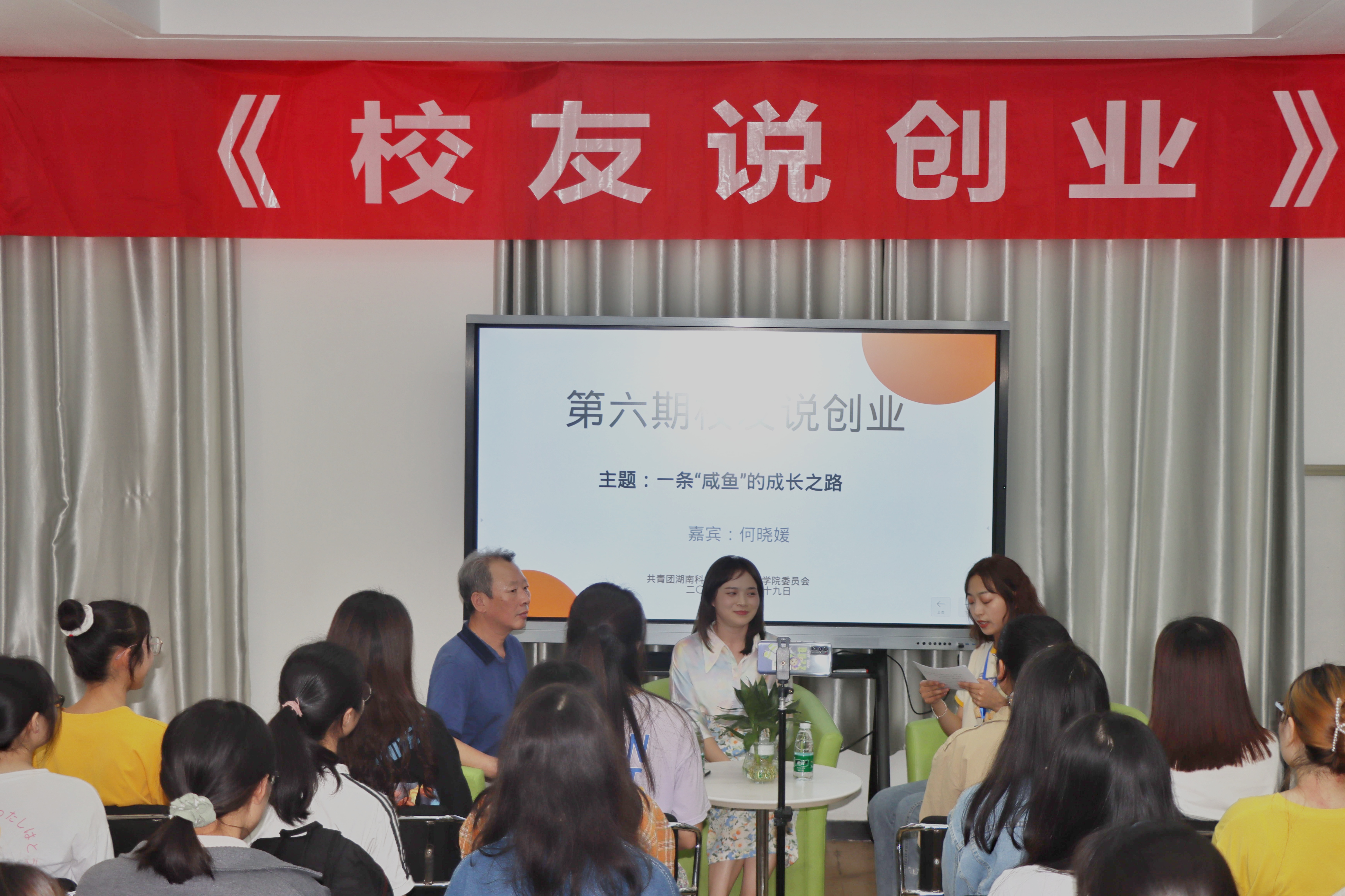 本网讯(通讯员 谭星宇;摄影 王帅)329日晚7:30,外国语学院于创新创业大楼317“聚师堂校企合作工作室举办主题为一个咸鱼的成长经历的第六期校友说创业活动。外国语学院院长欧华恩教授、团委书记刘罗应邀参与此次活动。本期活动的主讲人是2013届优秀毕业生何晓媛(任职经历 :从商务专员到运营总监,目前任职于深圳市华迅航空器材有限公司)。本期活动共有300余名学生以线上线下结合的模式参加。