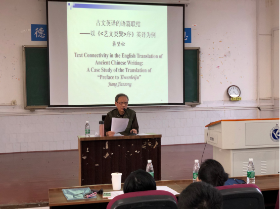 202011月6日,应外国语学院邀请,我国著名典籍翻译专家、中国译协资深翻译家、湖南师范大学博士生导师蒋坚松教授在博雅楼东三教室举行了题为“古文英译的语篇联结”的学术讲座。