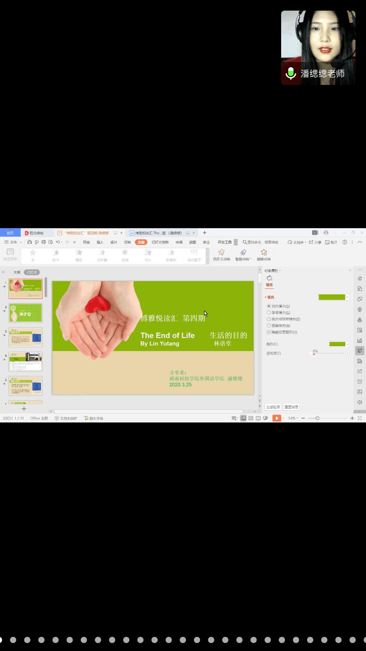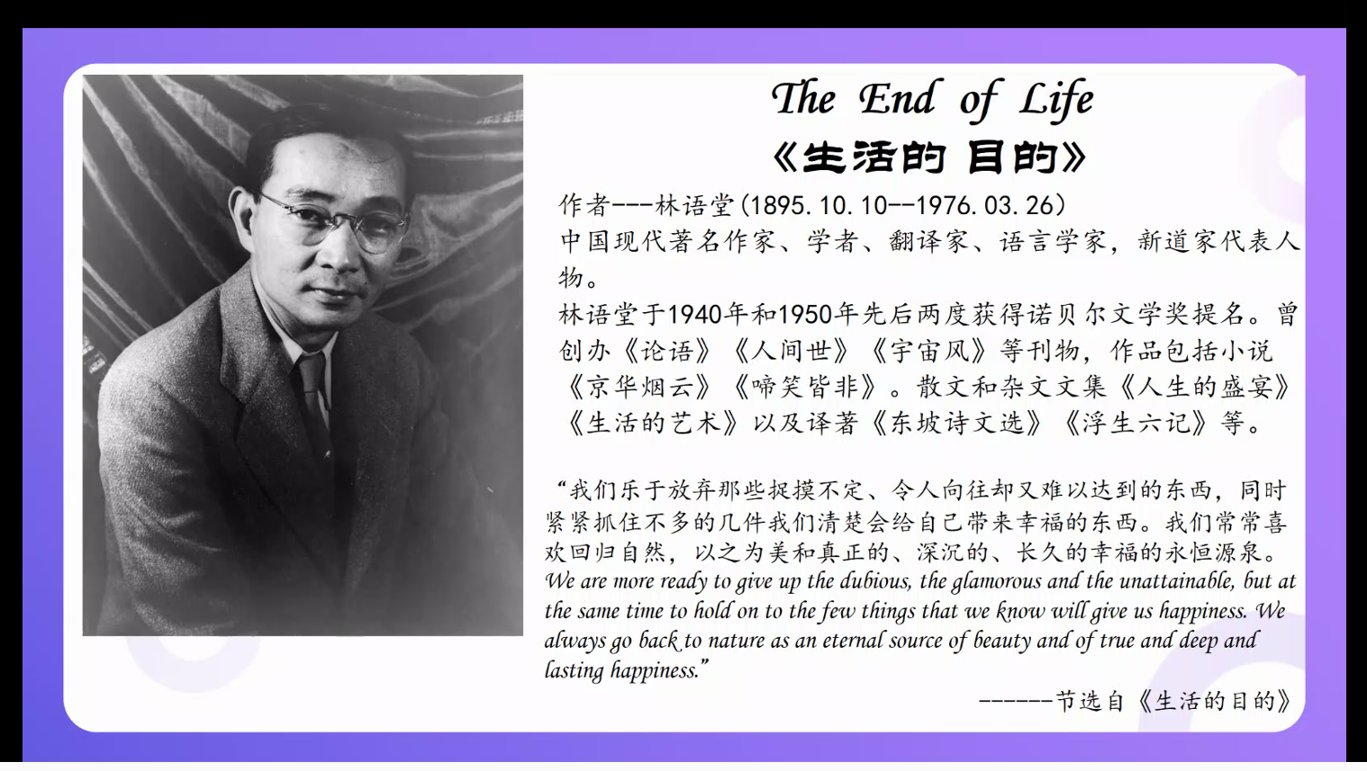 本次悦读汇邀请到的分享嘉宾是外国语学院专任教师潘缌缌,她曾荣获伟德国际1946源于英国实验实训教学比赛一等奖、伟德国际1946源于英国研讨式课堂比赛一等奖,她所分享的文章是林语堂的《The End of Love 生活的目的》。活动伊始,同学们以连麦的方式朗读了文章中自己喜欢的文段,并在评论区分享了自己在阅读过程中的所感所想。接着,潘缌缌老师为同学们介绍了文章写作的历史背景以及具体内容,以评论区互动的方式与同学们谈论了“生活的目的是什么”等系列话题。在倾听了同学们的朗读和感悟后,潘缌缌老师分享到:“从今天起,努力去做一个可爱的人,不羡慕谁,也不放弃目标,保持一颗萌萌哒的心,努力坚持进步。成长路上只有自己责无旁贷,所以你除了努力别无选择。真正重要的不是生命里的岁月,而是岁月里的生活。愿你们都能成为一个可爱的人”。