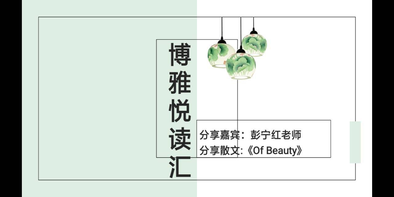 彭宁红分享了Francis Bacon培根的《Of Beauty》,彭宁红提出"究竟我们要追求怎样的美",来引导同学们产生对美的正确认识。通过观看短视频《一分钟了解弗朗西斯·培根》,大家对培根的思想有了进一步的了解,彭宁红对这篇语言简洁但蕴含丰富哲理的培根随笔《Of Beauty》进行了详细解读。她还分享了自己对这篇散文的读后思悟,“不必因外在缺陷而自忧自叹,而是要追求内在美的永恒”。她还让同学们多读书,读好书,用知识填充自己,增长智慧,才能变得越来越好,越来越美。