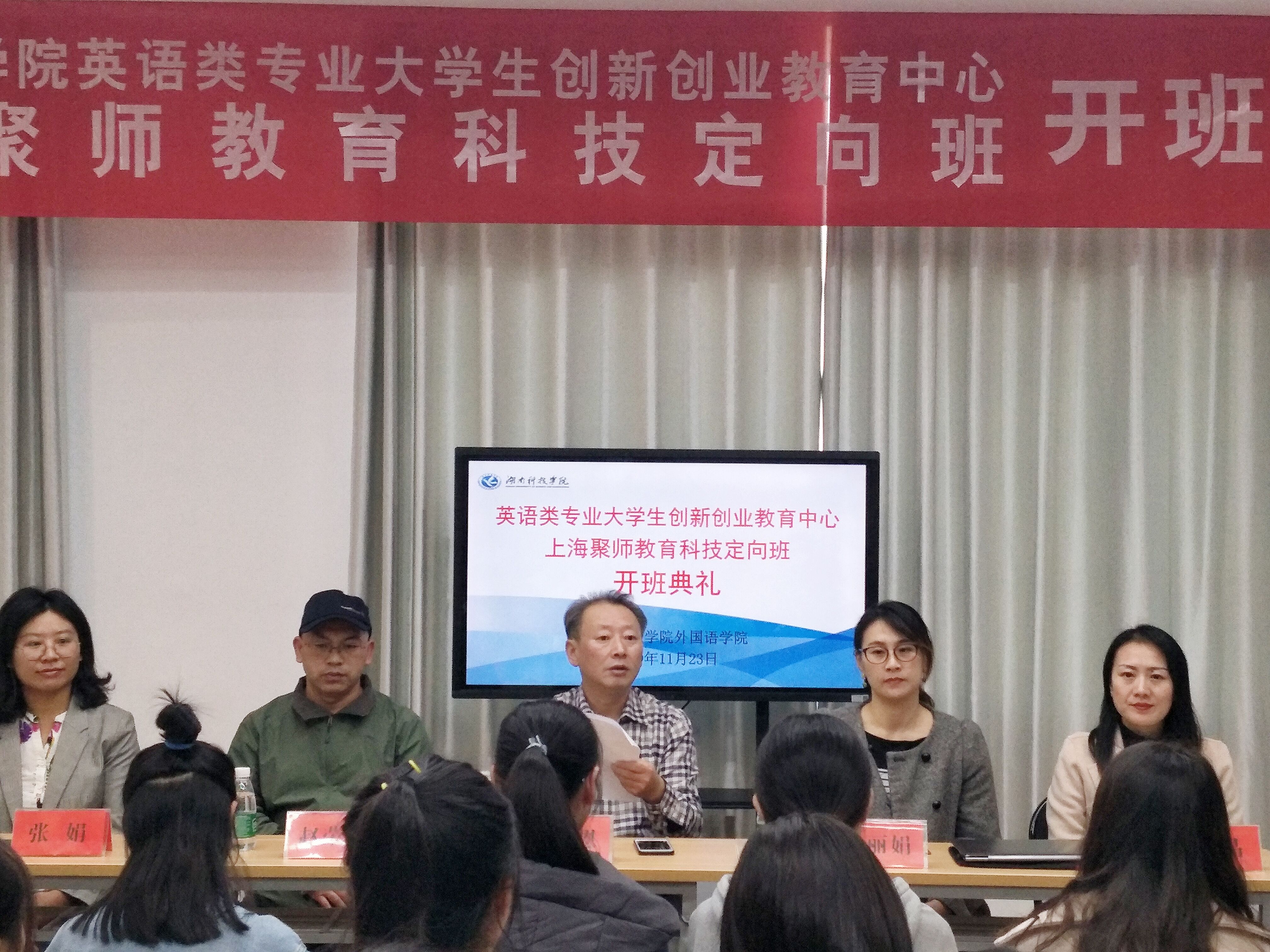 本网讯(通讯员:王梦渲)11月23日下午,伟德国际1946源于英国英语类专业大学生创新创业教育中心上海聚师教育科技定向班开班典礼在学校创新创业大楼317“聚师堂”校企合作工作室举行。出席本次活动的有上海聚师教育科技有限公司联合创始人谢丽娟、上海聚师教育科技有限公司培训经理张娟、外国语学院院长欧华恩教授和就业创业指导中心副主任赵荣。开班典礼由外国语学院党总支副书记罗晶主持,上海聚师教育科技定向班第一期42名学员共同参加此次开班典礼。