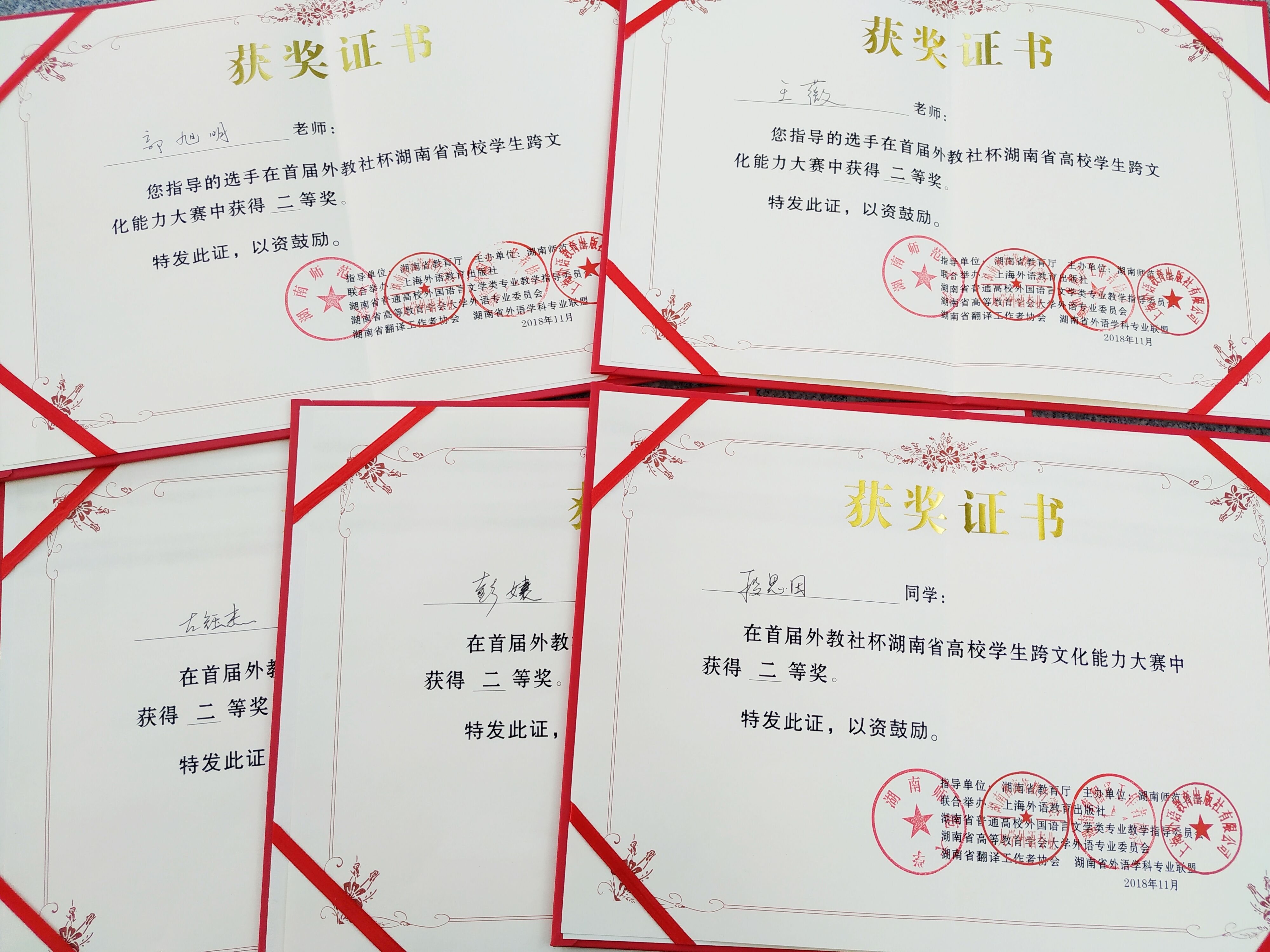 11月25日,第一届“外教社杯”湖南省高校学生跨文化能力大赛在湖南师范大学落下帷幕,由外国语学院英语1603班彭婕同学、汉文1603班段思田同学和国贸1602班左钰杰同学组成的团队从激烈的竞争中脱颖而出,荣获二等奖。