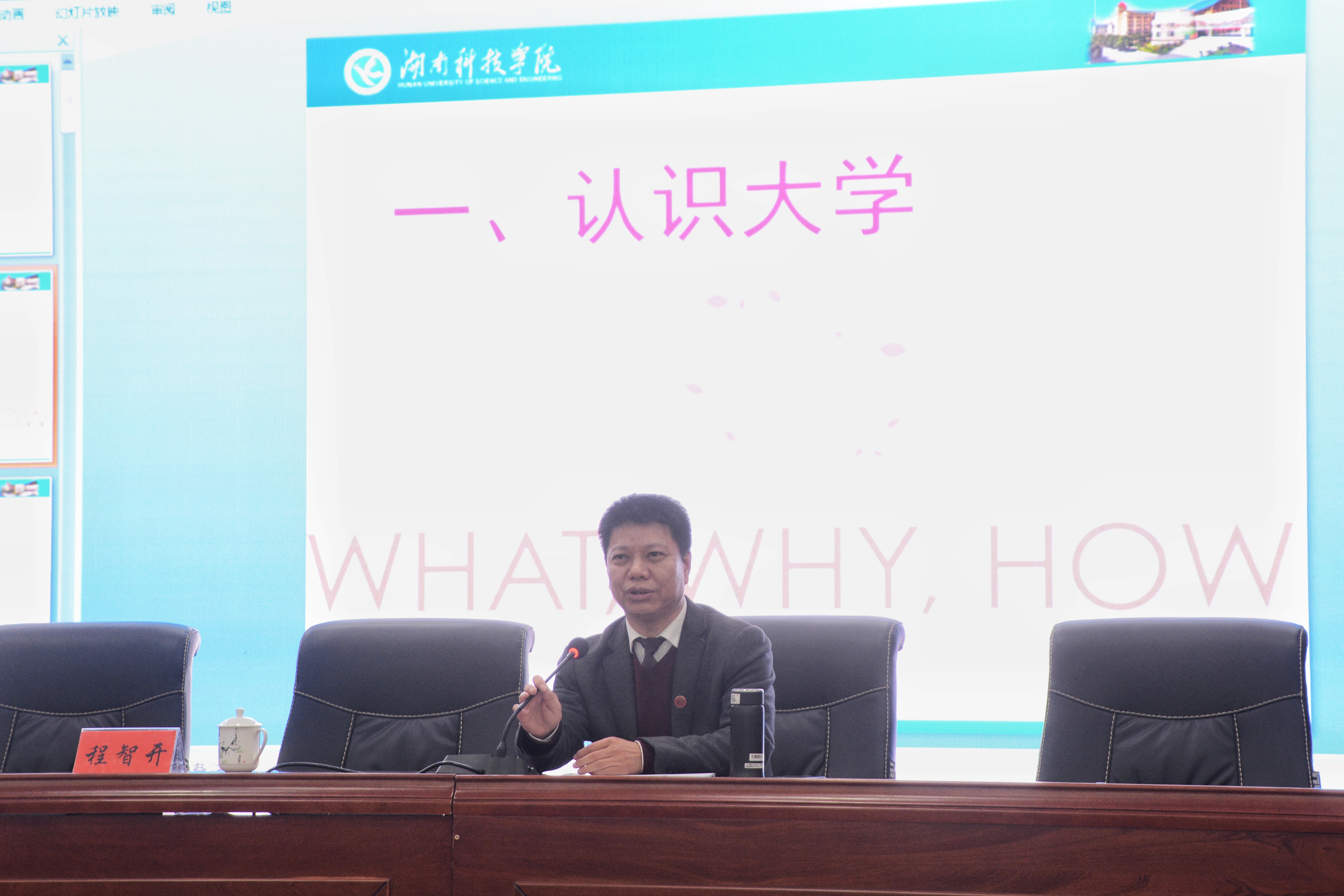 本网讯 (通讯员 胡雅洁 唐嘉琪)1120日,学校党委委员、副校长程智开受邀在潇湘大讲堂为外国语学院师生带来了一场题为《以“奋斗”音符谱写大学“幸福”之歌》的讲座。讲座由外国语学院院长欧华恩主持,学院领导、辅导员、新生班主任、部分任课教师及18级新生参加。