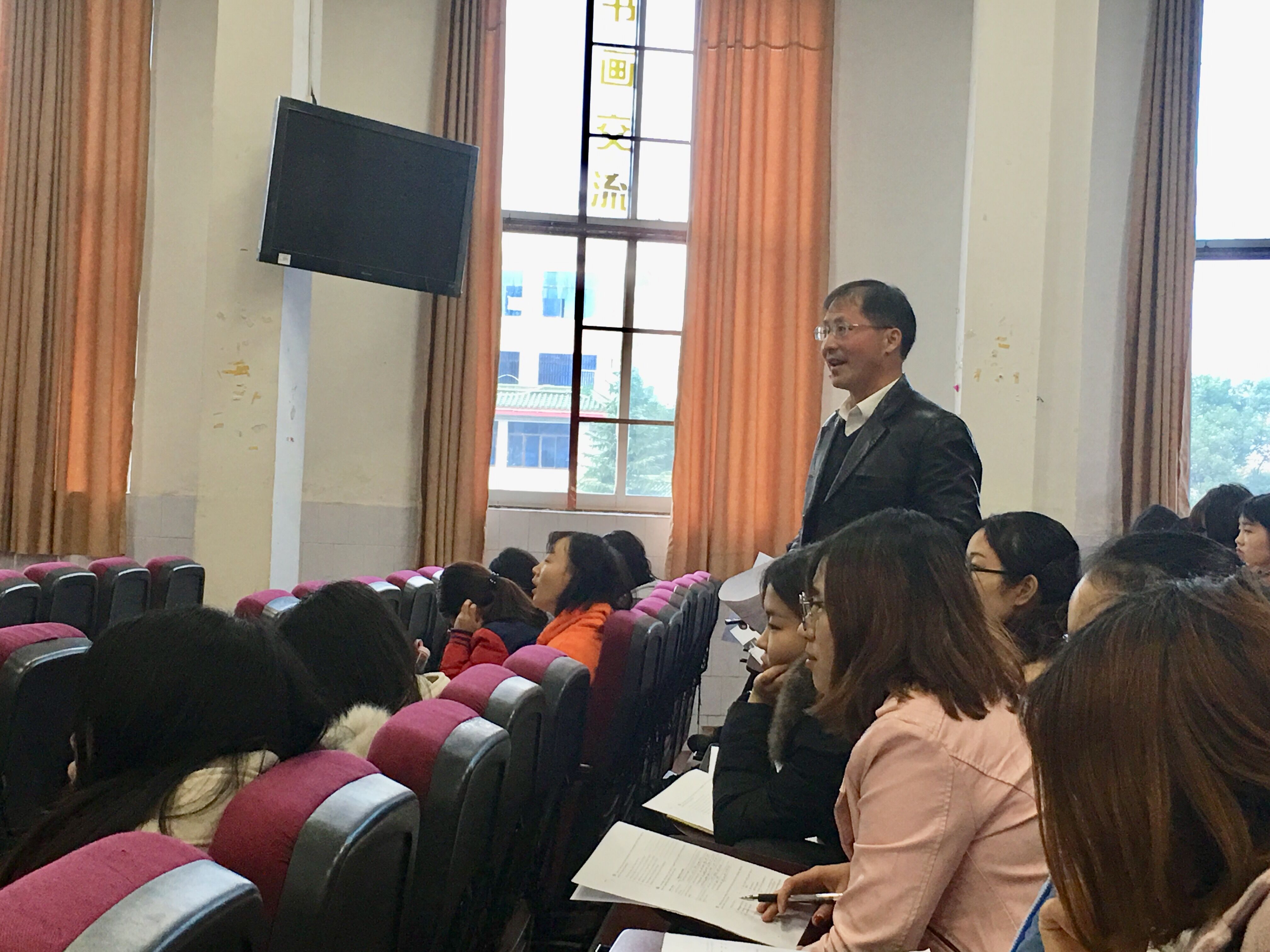 本网讯(通讯员 杜俊杰)12月5日下午,外国语学院邀请87级校友、宁远一中副校长、正高级英语教师陈清祥来校为15级英语师范专业学生讲学。外国语学院院长欧华恩主持讲座。